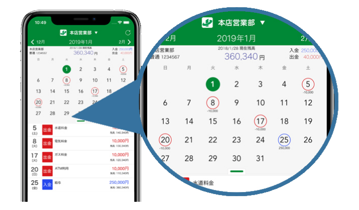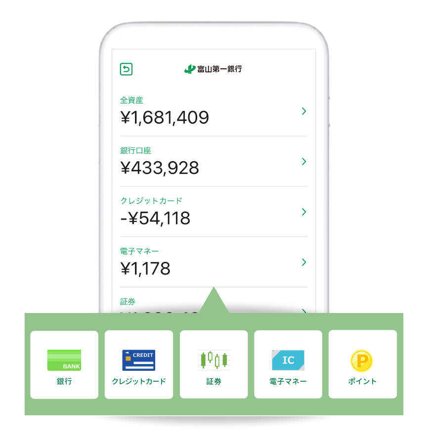 富山第一銀行の口座と各種クレジットカード情報をカレンダー形式で直感的に閲覧できます。