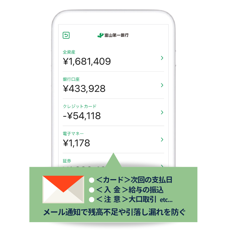 給与振込やカード引き落とし、大口取引をメールでお知らせします。