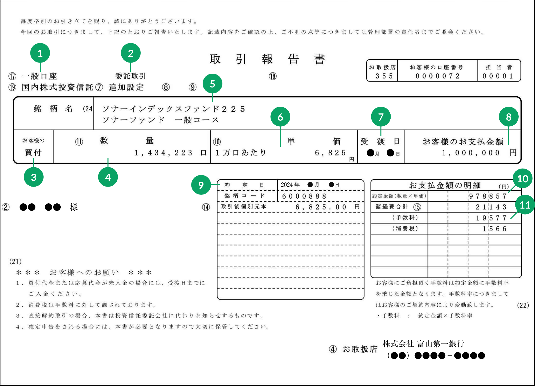 - 約定日、ファンドの名称、受渡代金等を確認しましょう。