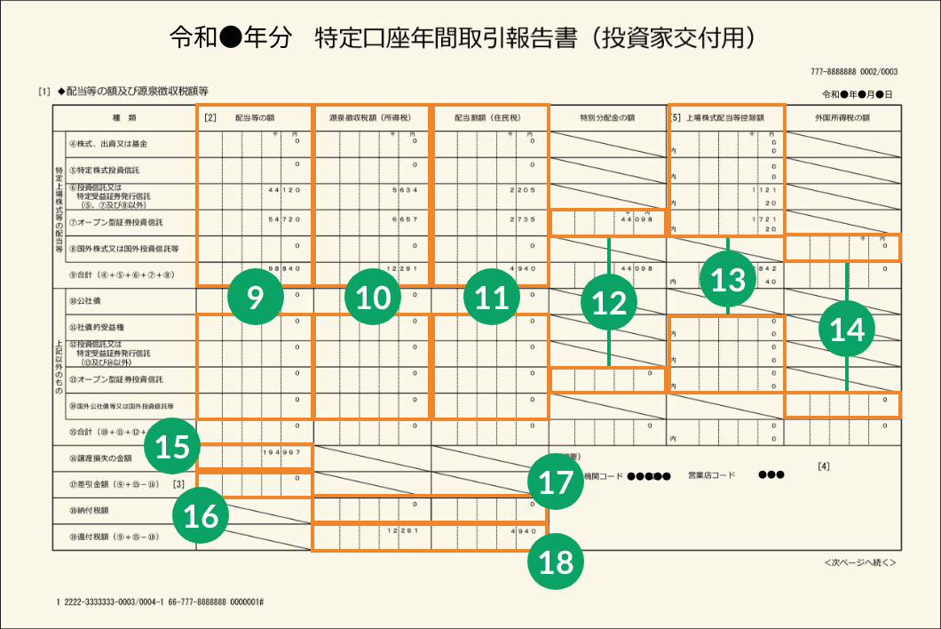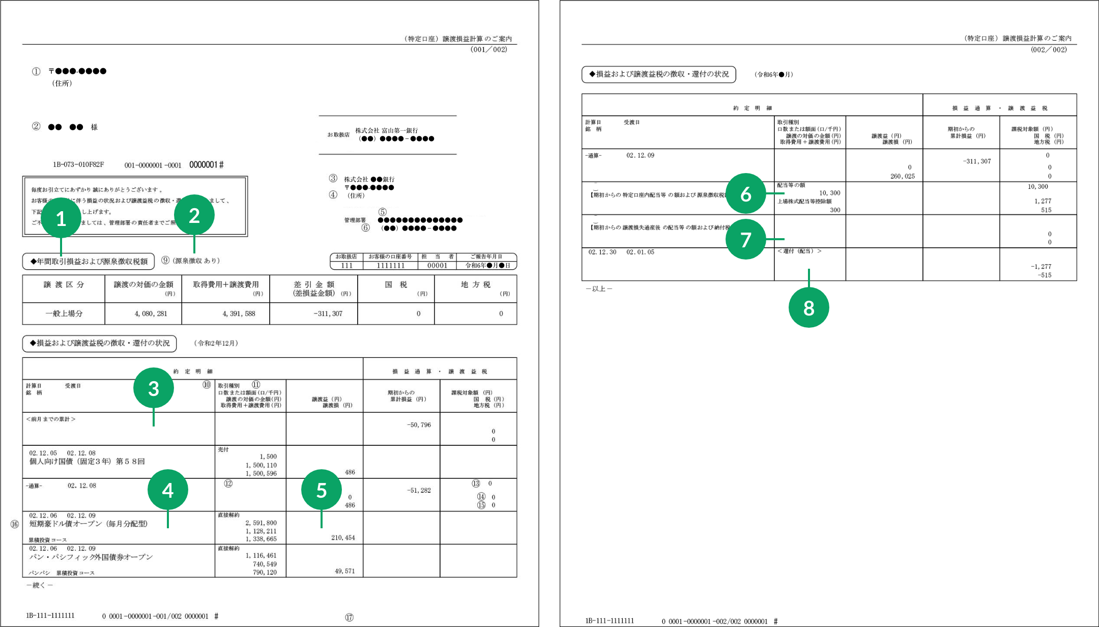 特定口座のお取引については、「特定口座年間取引報告書」で年間(1月1日~12月31日)の譲渡損益額・配当等の額、源泉徴収税額をご確認いただけます。報告書は、翌年1月中(特定口座を廃止した場合は、廃止月の翌月)に送付いたします。