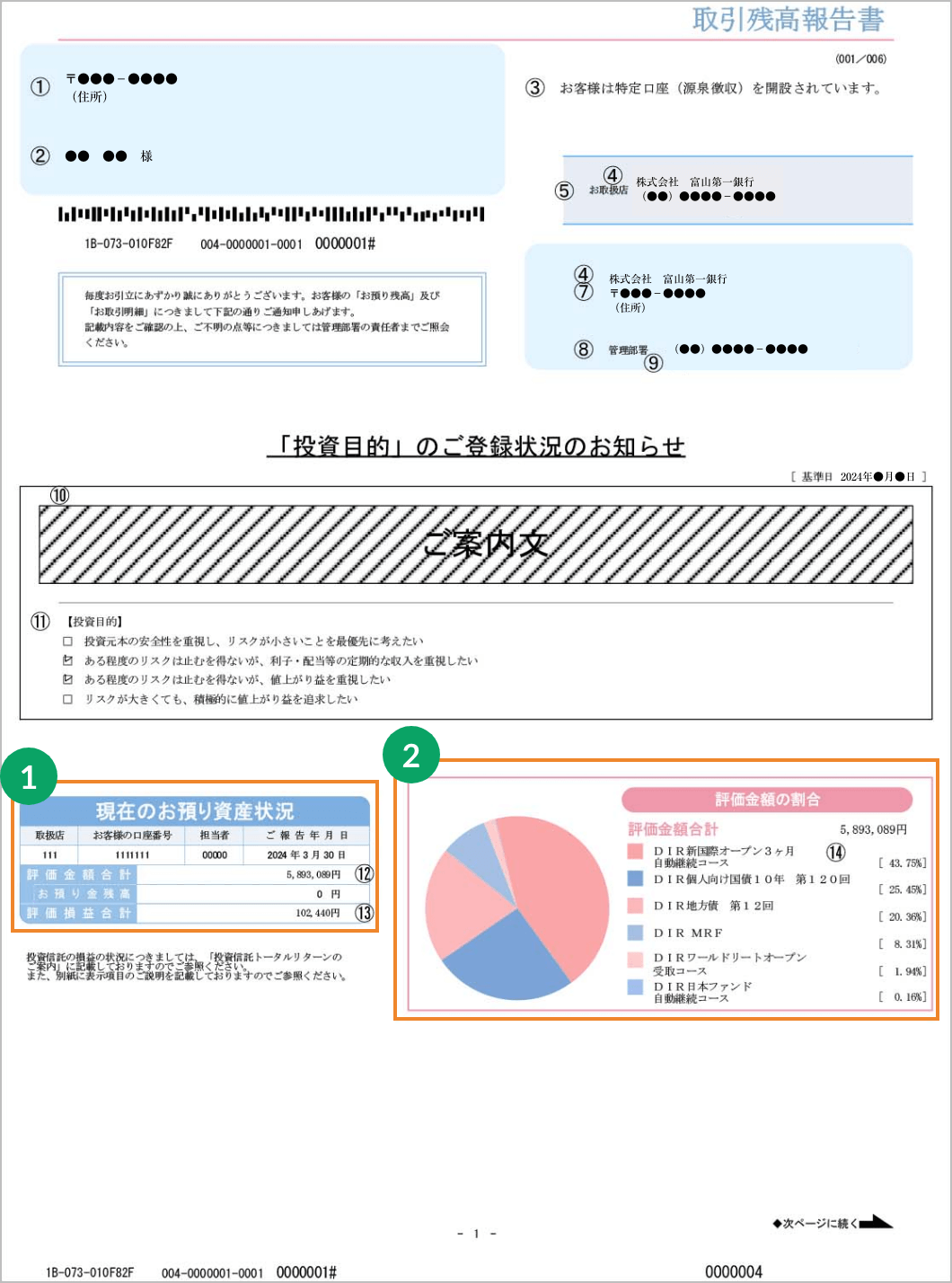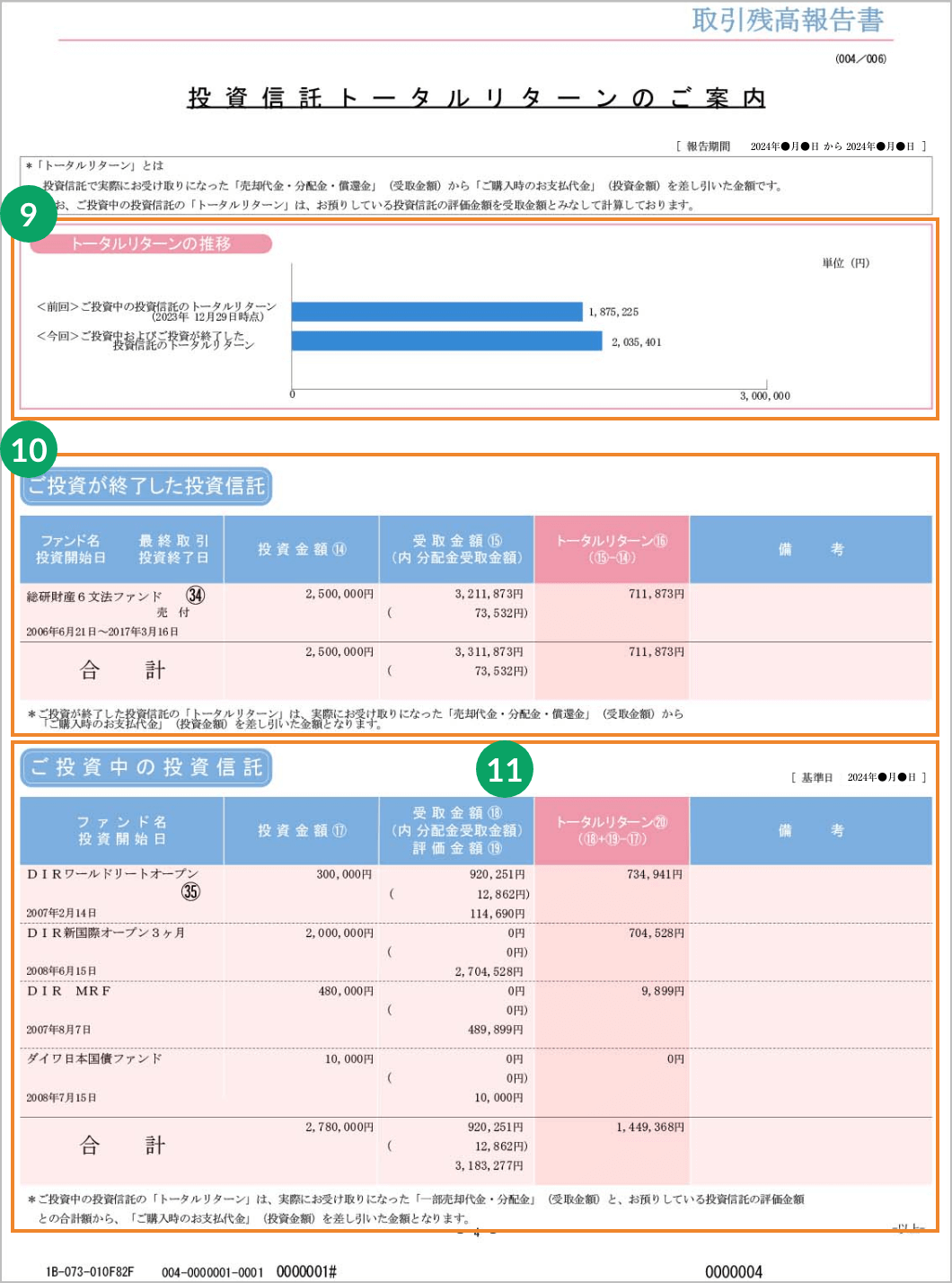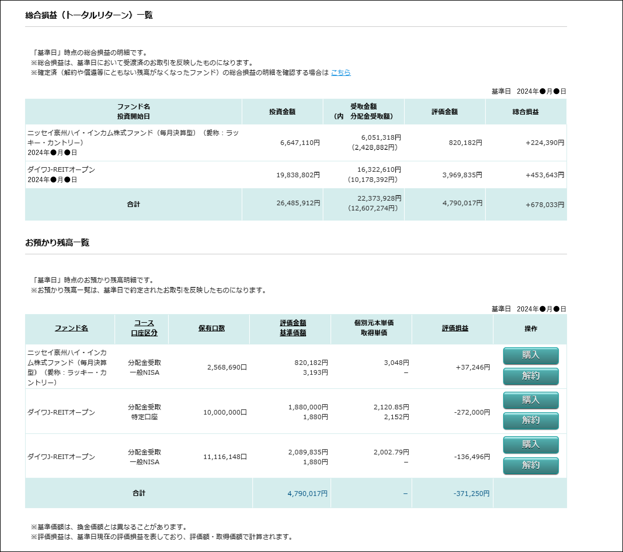 基準日時点で投資中のファンドの投資状況を表示します。期間中に投資中のファンドがない場合には「♦ご投資中の投資信託はございません」と表示します。