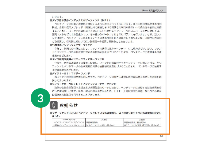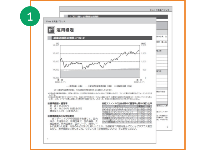 「運用報告書」は、ファンドの決算ごと(決算期間が6ヵ月未満のファンドは6ヵ月ごと)に運用会社が作成します。ファンドの状況が簡潔に記載されている「交付運用報告書」は、決算時のファンド保有者全員に送付されます。ファンドの状況が詳細に記載されている「運用報告書(全体版)」は、運用会社のホームページもしくは当行ホームページの各ファンド詳細画面より取得できます。