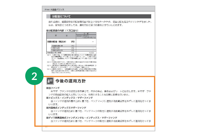運用会社が投資信託のファンドごとに作成する「月次レポート」は「月報」や「マンスリーレポート」と呼ばれ、運用実績や組入れ上位銘柄、分配金の推移、ファンドマネージャーのコメント等がご確認いただけます。