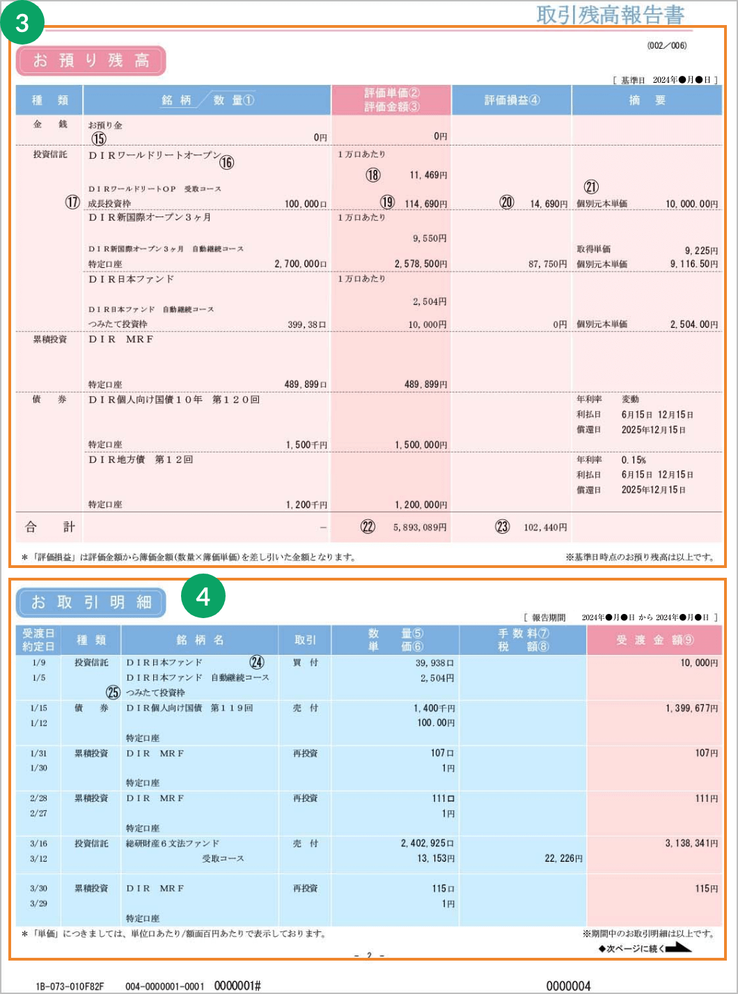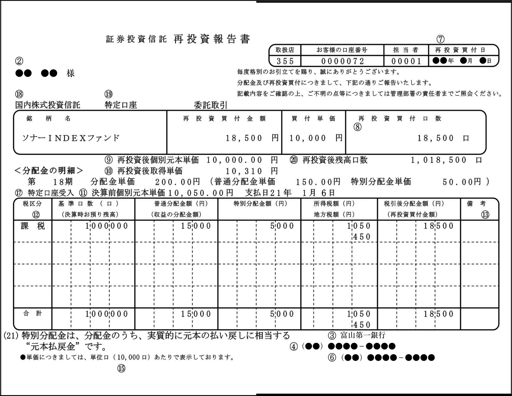3段目にファンド愛称および分配金再投資コースの場合「再投資コース」、分配金受取コースの場合「受取コース」と表示します。 - 譲渡益・譲渡損