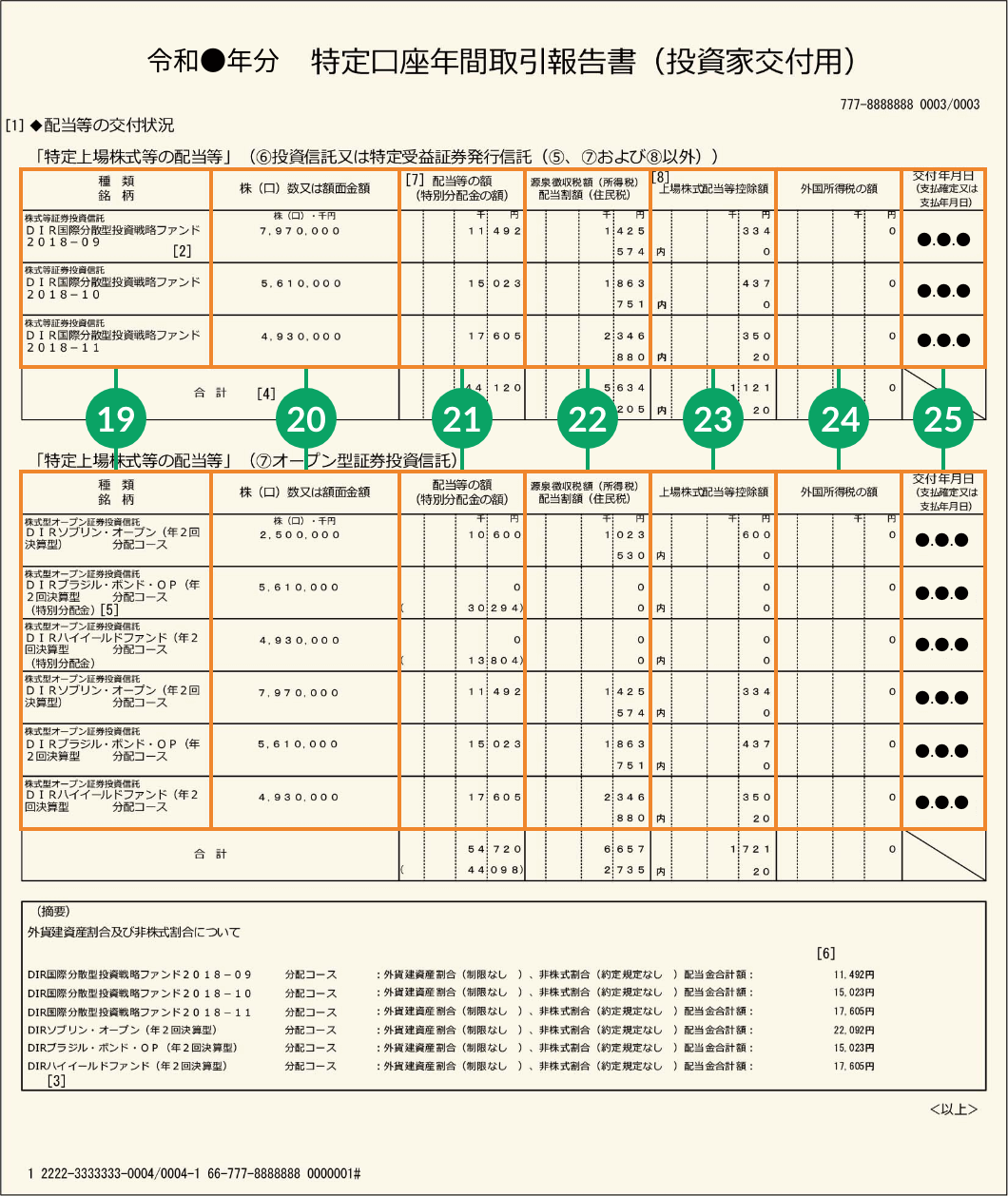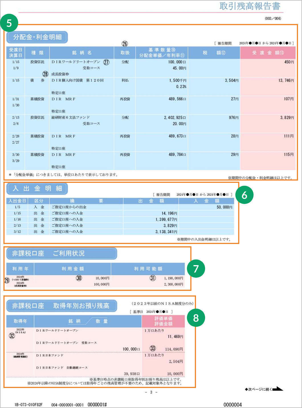 「取引口座名称」・・・特定口座の場合「特定口座」、2023年までのNISAの場合「NISA」、2023年までのつみたてNISAの場合「つみたてNISA」、成長投資枠の場合「成長投資枠」、つみたて投資枠の場合「つみたて投資枠」と表示します。 - 分配金明細