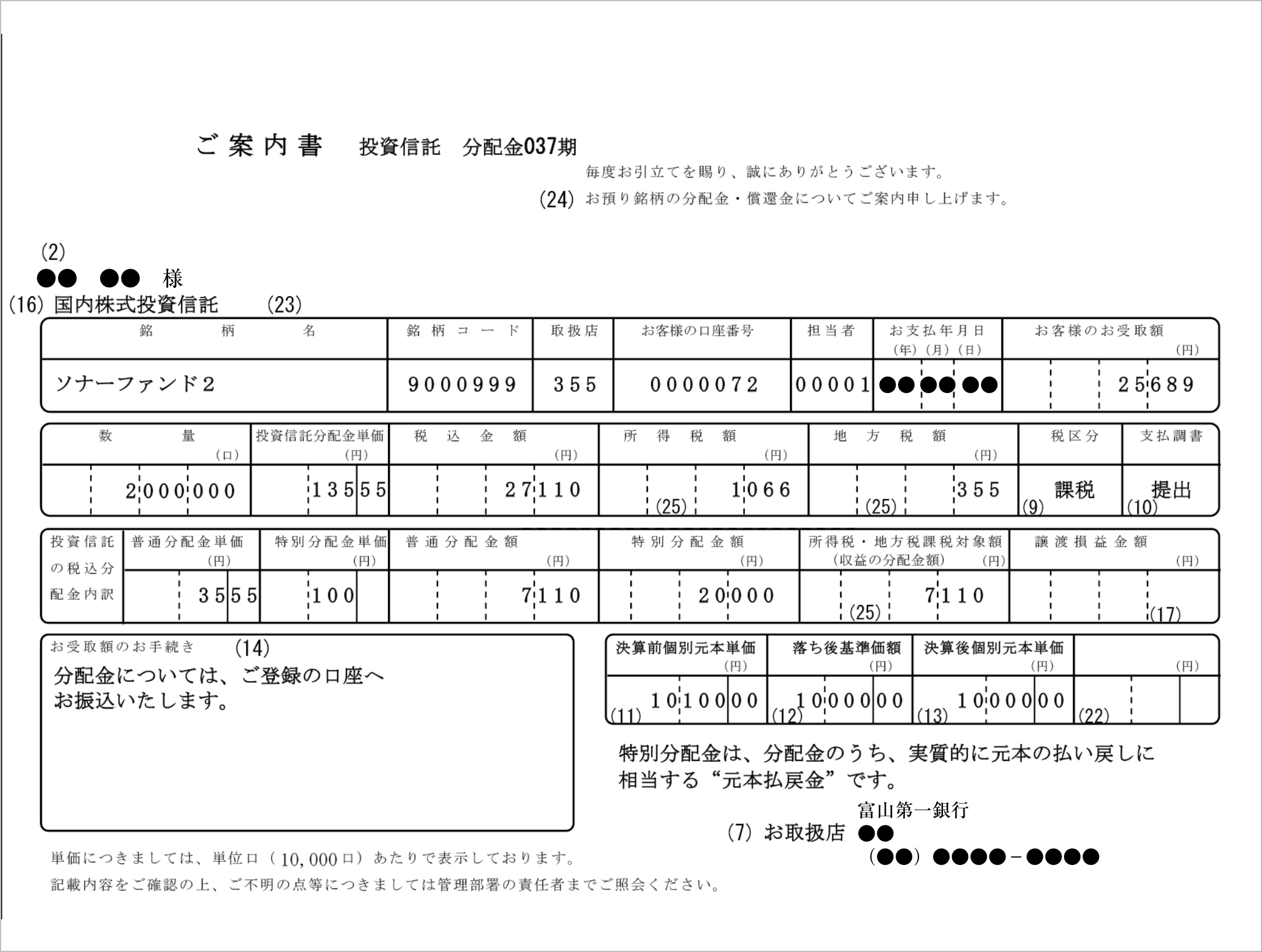 元本払戻金(特別分配金)が支払われた場合、下段括弧内に表示します。 - 源泉徴収税額(所得税)・配当割額(住民税)