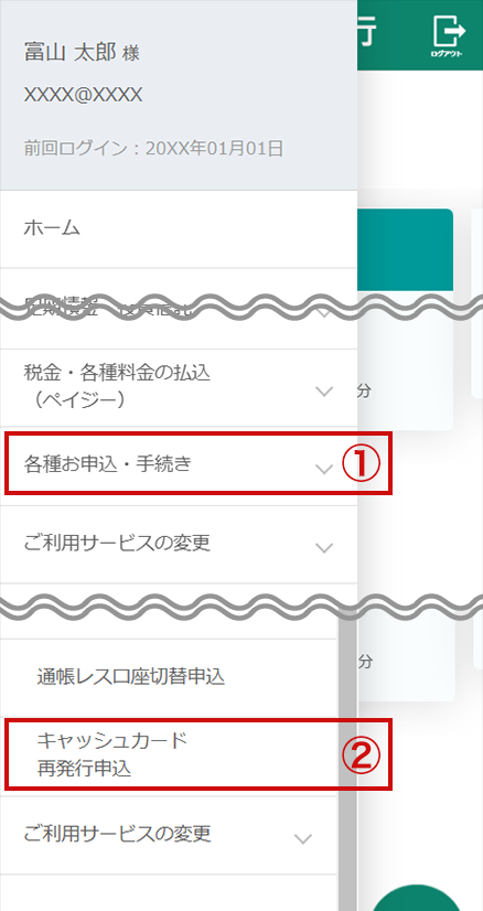 ①「各種申込・手続き」をタップした後に表示される②「キャッシュカード再発行申込」をタップしてください。