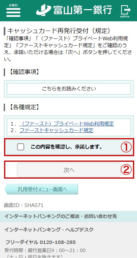 各種規定をご確認いただき、①チェックボックスをタップした後に②「次へ」ボタンをタップしてください。