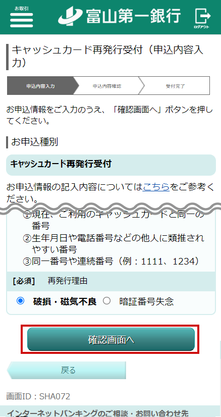 • キャッシュカードの再発行理由が破損、磁気不良、暗証番号失念であること 等