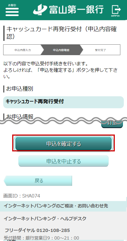 確認画面に記載された情報に誤りがないかご確認いただいた後、「申込を確定する」ボタンをタップしてください。